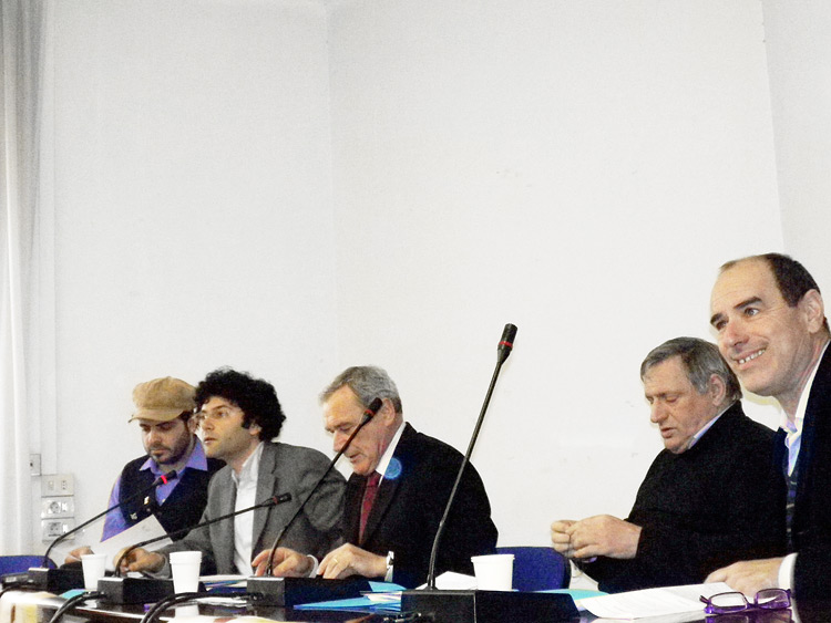 01 da sinistra Cesco, cantante degli Après La Classe, Alessandro Cobianchi, Coordinatore nazionale Carovana Antimafie, Pietro Grasso, Procuratore Nazionale Antimafia, Don Luigi Ciotti, presidente di Libera e Gabriele Santoni, vicepresidente di Avviso Pubblico. |