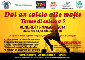 Venerdì 16 maggio 2014, a Pianoro, in provincia di Bologna, dalle ore 14.30 alle 19.00, presso il Campo Sportivo (Via dello Sport, 4 - Pianoro) si terrà l’incontro “Dai un calcio alle mafie”, torneo di calcio a 5. Il torneo è organizzato dal Comune di Pianoro e dall'Associazione Sportiva calcistica locale - Sporting Pianorese 1955 - in collaborazione con un gruppo di ragazzi che nel corso della scorsa estate hanno partecipato ad un campo di volontariato a Isola Capo Rizzuto, in Calabria, presso la cooperativa Terre Joniche.